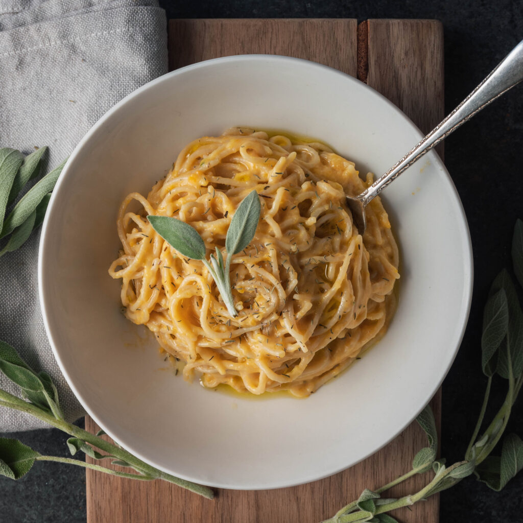 - Fish out the sage leaves, then use a hand blender to blend the butternut squash mixture until it's completely smooth and creamy. If your sauce is too thick, you can add another 1/4 cup of Lifeway Kefir or veggie broth. Add the cooked pasta to the sauce and toss well to coat, top with additional nutritional yeast (or Parmesan cheese). Add more salt and garlic powder if needed. Top with fresh sage leaves as a garnish, and enjoy.