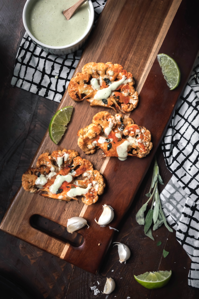 - 1 head of cauliflower, cut into thin 1 inch slices that look like steaks