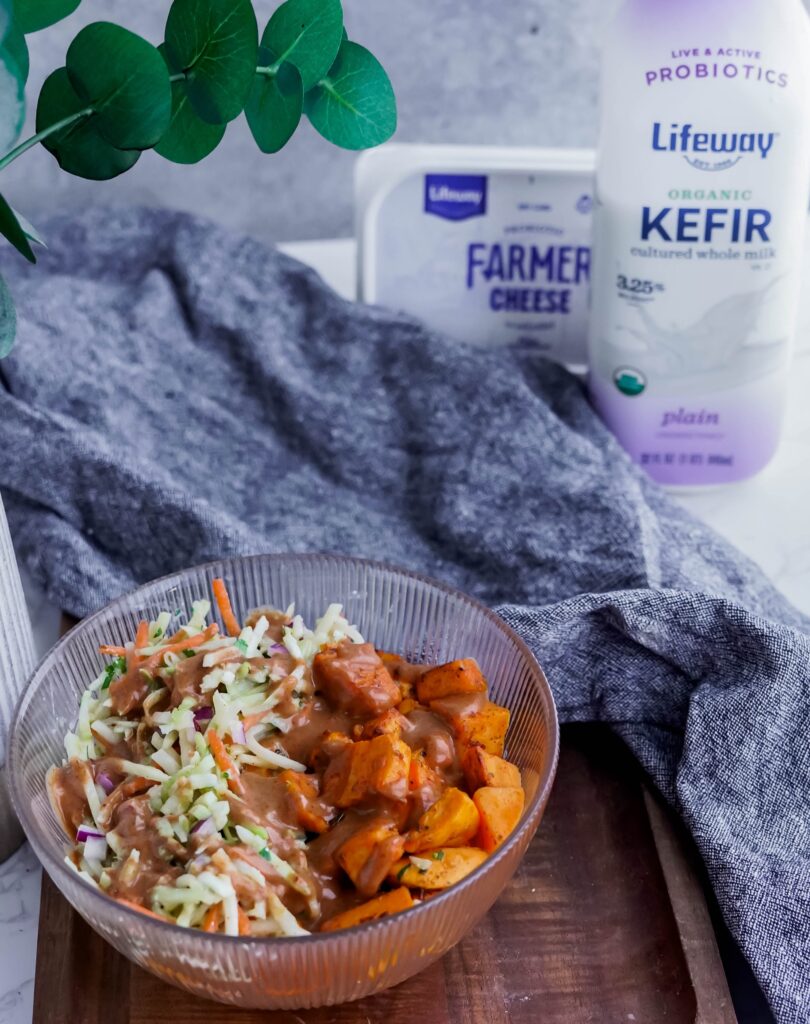 Both Lifeway Kefir and Farmer Cheese are rich in live probiotics along with other key nutrients the body needs. When combined with hot honey, coleslaw, and flavorful spices, they create a delicious gut-healthy bowl you can enjoy all year round.