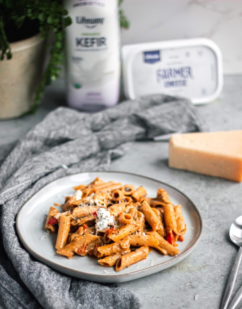 After marinating, we mix the chicken with vegetables and penne pasta, then top it a sauce made with our kefir and Lifeway Farmer Cheese. Rich with flavor and ideal in texture, our Kefir Cajun Chicken Pasta is a wholesome, hearty meal that is sure to please everyone at the dinner table.