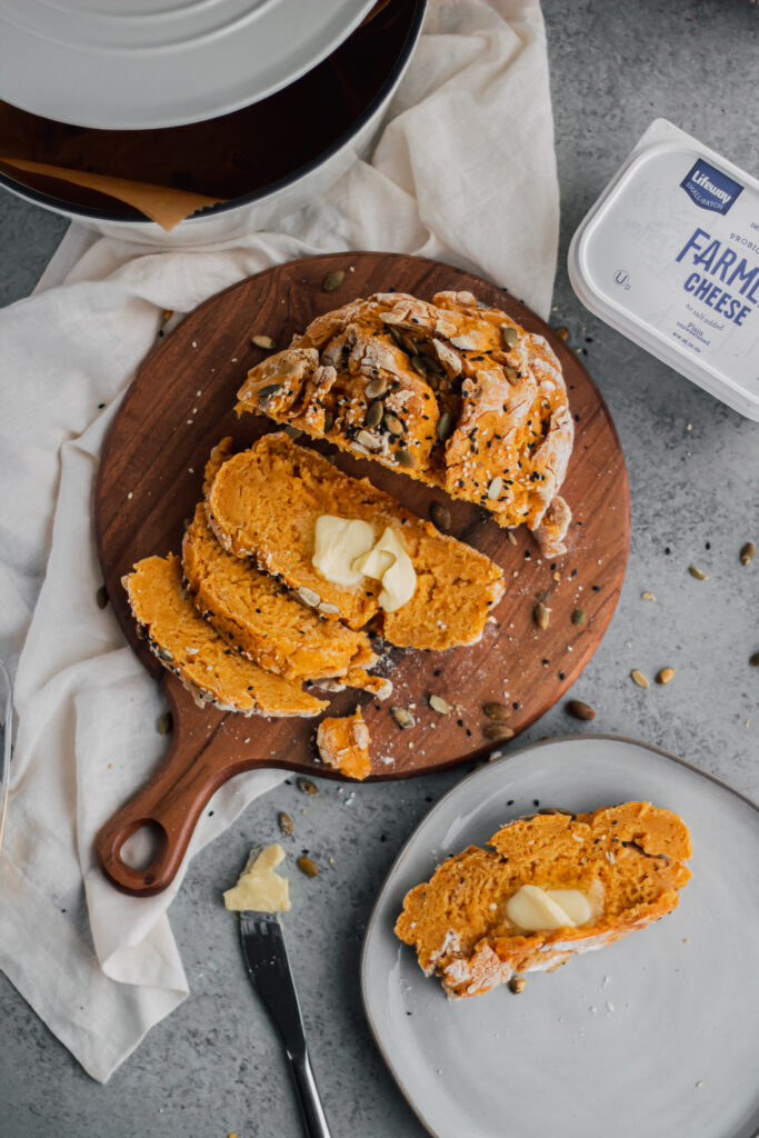 Looking for a beautiful bread to enjoy on a crisp fall morning? Our Seeded Fall Pumpkin Bread blends traditional autumn flavors with tangy Lifeway Farmer Cheese to create bread that belongs in every autumn recipe arsenal. Protein-packed Lifeway Farmer Cheese is the secret ingredient that gives this bread a satisfyingly crisp outer crust and moist and springy center. It’s superb. Just remember to spread a little extra on top when you serve it!